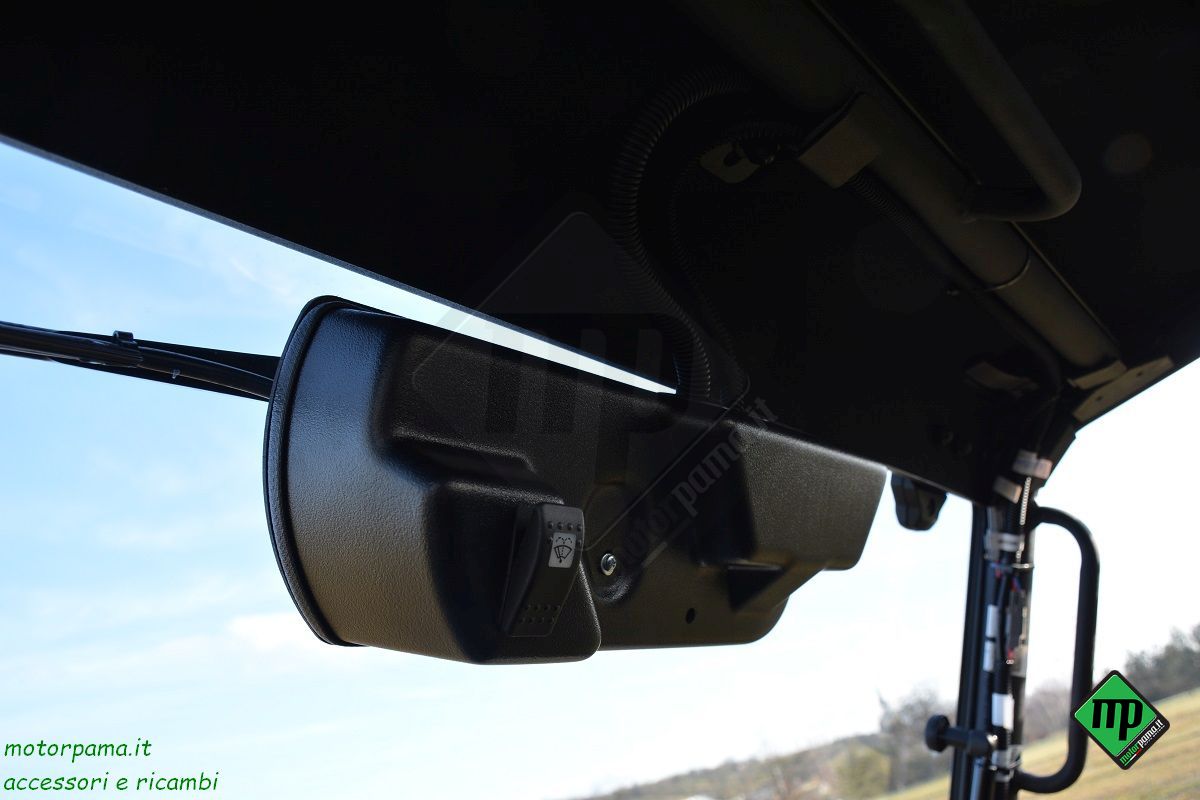 - Dettaglio vetro anteriore: Il parabrezza è realizzato in vetro di sicurezza temprato laminato, caratterizzato dalla funzione di inclinazione in due posizioni, assistita da due pompanti idraulici. Fissato al tettuccio di protezione con un sistema di bloccaggio in metallo, si blocca in due posizioni per favorire l'ingresso dell'aria.