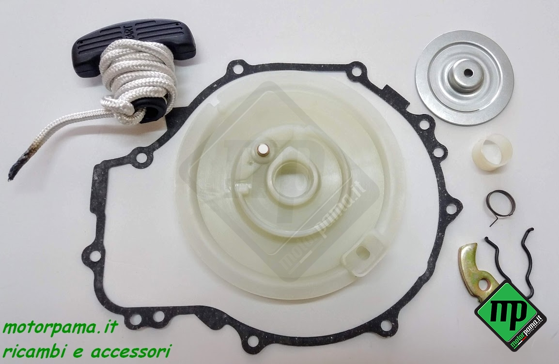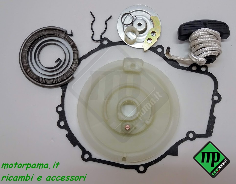 Il kit include la bobina di avviamento, la molla di ritorno, il nottolino, la molla di avviamento, il piatto di avviamento, la molla, la boccola, la guarnizione contraccolpo e la corda per la messa in moto.