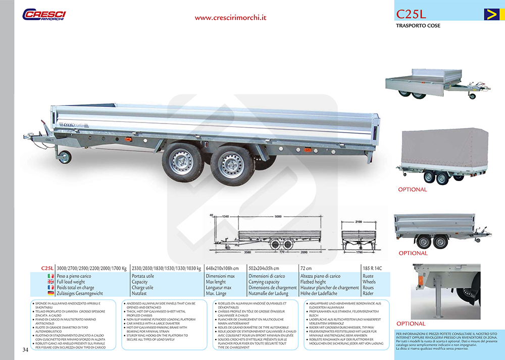 Carrello / rimorchio Cresci Rimorchi PT35CL solido, pratico e affidabile, progettato per trasporti ingombranti con grande facilità. Dotato di una capacità di carico straordinaria.