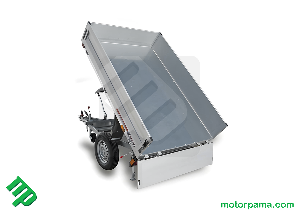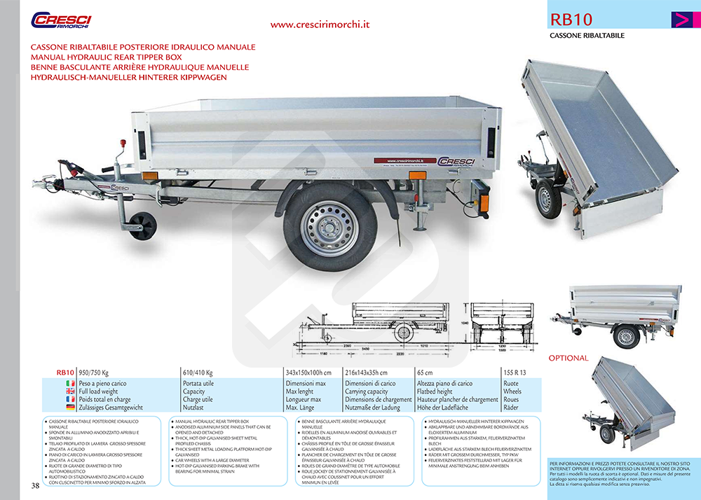 Carrello / rimorchio Cresci Rimorchi RB10 dodato di cassone posteriore ribaltabile idraulico manuale e sponde apribili o smontabili alte 35cm. Ideale nell' ambito edilizio ed agricolo.