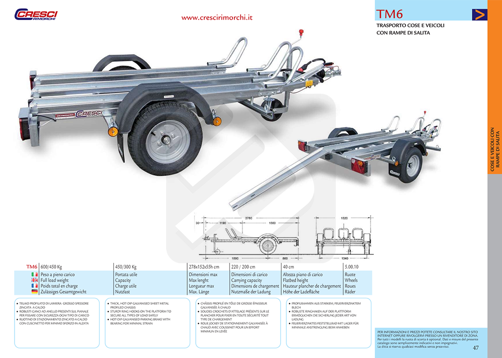 Carrello / rimorchio Cresci Rimorchi TM6 adatto al carico e scarico di mezzi a due ruote o quad/atv. Permette di trasportare fino a tre motocicli contemporaneamente, il carico dei mezzi è facilitato grazie all'apposita rampa di salita.
